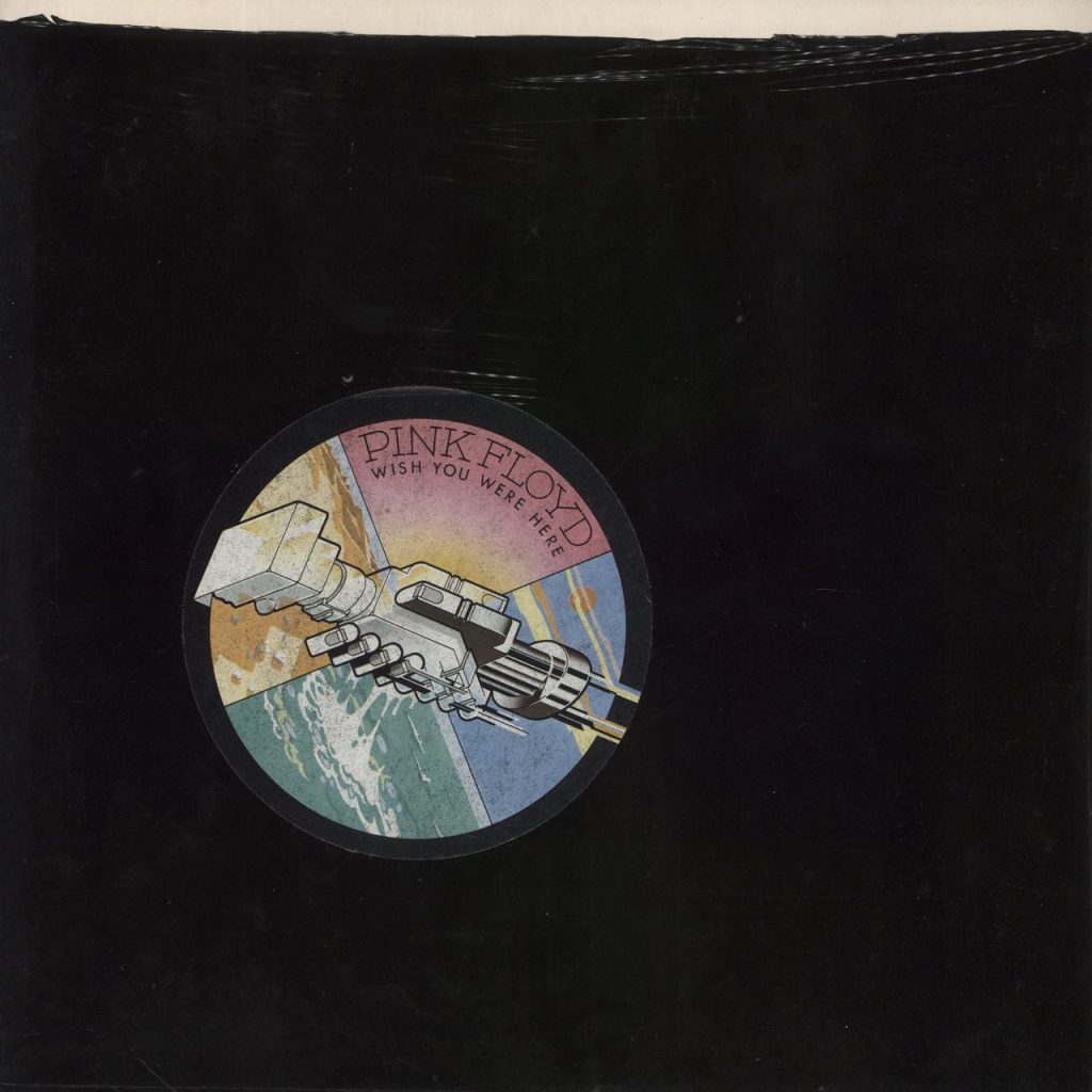 PINK FLOYD Wish You Were Here (Rare 1975 UK first issue 5-track vinyl LP with ‘EMI Records Ltd’ perimeter text on the labels & ‘Waters-Gilmour-Wright’ label credit for Part 5, indicating a first press, complete with the heavy card lyric inner with cropped corners [later issues had rounded corners], glossy postcard with pinked edges & pinched spine picture sleeve, still with the original opened black shrinkwrap with the custom circular sticker attached on the front as well as the original vintage price sticker SHVL814)