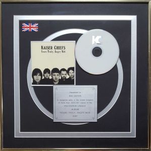 KAISER CHIEFS Yours Truly, Angry Mob (Official 2007 UK In-House Platinum CD award issued to commemorate album sales in excess of 300,000 copies. This nicely framed and glazed award measures 16″ x 16″ in size, and features a Compact Disc slightly overlapping the album artwork which is slightly overlapped by the authentic, custom engraved dedication plaque, with matt black die-cut surround with silver backing and the Union ‘Jack’ flag in the top left corner, within a metal frame. A really nice looking item and the first award we have ever had for this group)